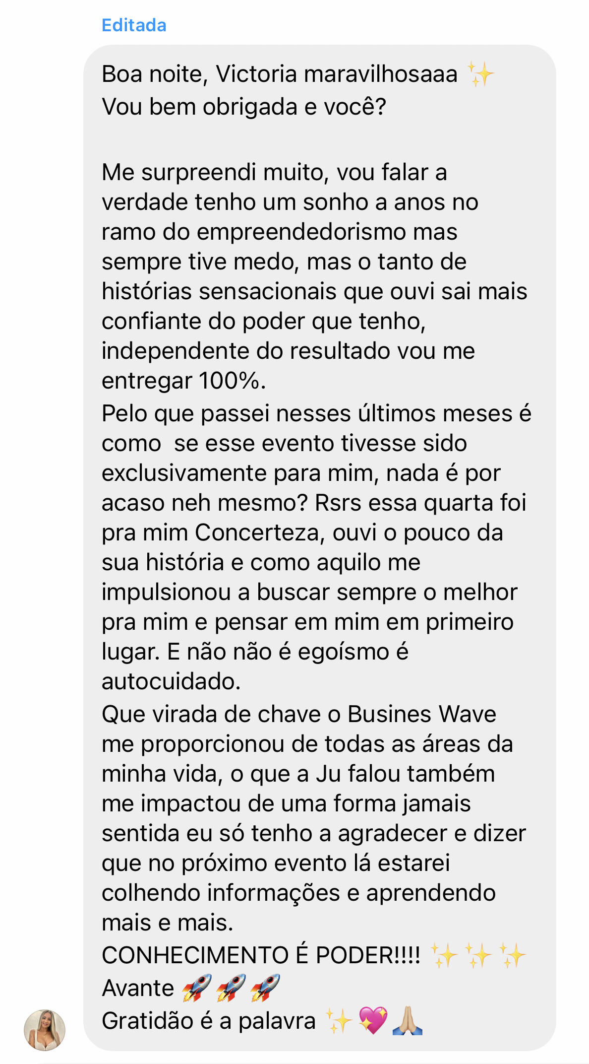 O Business Wave – agora na sua Quarta edição – já impactou dezenas de mulheres que saíram de onde estavam e alcançaram seus objetivos. Mulheres que destravaram suas carreiras, construíram negócios sólidos e, acima de tudo, descobriram o poder de estar cercadas por quem realmente impulsiona o sucesso.